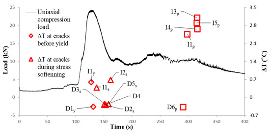 at crack I1 also decreases. A series of cracks consisting of 4 types D and 1 type I occur immediately before the transition to plastic deformation at 162.0 s. Afterward, the load remains relatively constant as the compression reaches its plastic stage and no crack occurs until t = 265 s when the cracks later form the initiating global failure line. From t = 265 s to t 300 s, the global failure surface gradually grows by connecting the individual cracks and the temperature along with it generally increases. The total increase in temperature at these series of cracks are all above 2.1 °C.