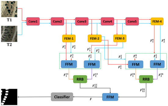- IFN [45] first uses the two Siamese network architectures as the raw images feature extraction network. To enhance the integrity of change map boundaries and internal densities, multi-level depth features are fused with image difference map features by an attention mechanism.