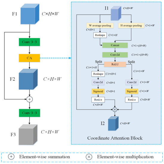 In Figure 2, first, a convolution operation is performed on the input F1. Then it is fed into the CA block to obtain the weighted feature map, . Feature maps F1 and F2 are merged into one feature map by element-wise summation, and a convolution operation is used to obtain F3.