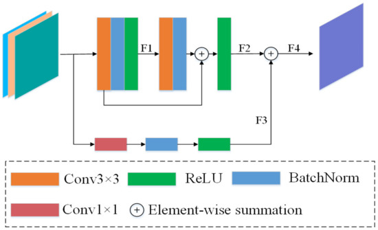 As can be seen in Figure 4, the RRB has three inputs, one of which is the difference map of two feature maps. The three feature maps are first subjected to a concatenation operation, followed by two consecutive convolution blocks, each consisting of Conv, BN, and ReLU. The two convolution blocks output the feature maps and , respectively. Here, it should be noted that the number of channels of each convolutional block output is different. In addition, the module adds additional residual connections with the convolutional layers for obtaining some additional spatial information of the remote sensing images. Finally, the four feature maps are subjected to element-wise summation and the final output feature map is obtained.