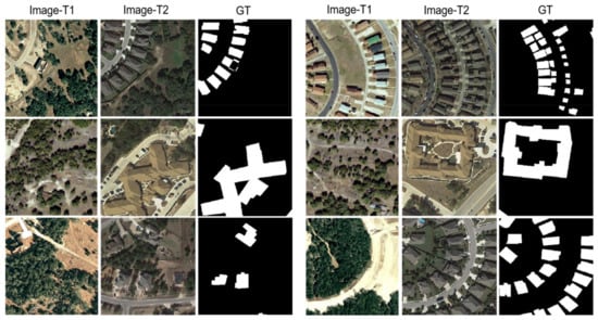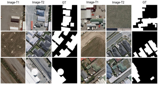 Illustration of samples from LEVIR-CD. (Image-T1) and (Image-T2) indicate the bi-temporal image pairs. (GT) indicates the ground truth.