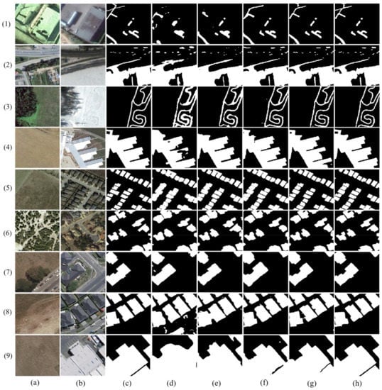 Illustration of a qualitative comparison on dataset WHU-CD. (a–h) indicate samples from WHU-CD and the change maps obtained with different methods. The white color indicates the changes that were correctly detected. Black indicates that no changes have been correctly detected. Red indicates false alarms. Blue indicates unpredicted changes.