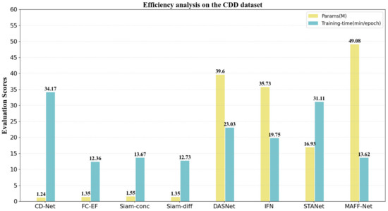 In this section, the proposed network MAFF-Net is evaluated on three publicly available benchmark datasets to demonstrate its effectiveness. First, the details of the three datasets, the CDD dataset [60], the LEVIR-CD dataset [42], and the WHU-CD dataset [61], are introduced. Next, the implementation details are presented, including the experimental environment and evaluation metrics. Then, seven state-of-the-art (SOTA) comparison methods are introduced. In this section, quantitative and qualitative analyses of these methods are presented on three datasets.