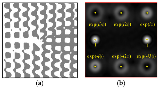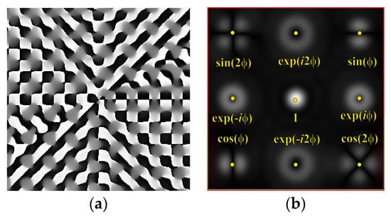 The form of the phase function of an eight-channel DOE, matched with optical vortices, is shown in Figure 1a. The zero order (m = 0) is shifted from the optical axis in accordance with formula (2) by adding the carrier frequency. The central part of the focal plane is not used for useful information in order to reduce the influence of interferences localized in the central part.