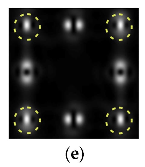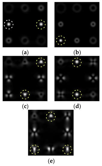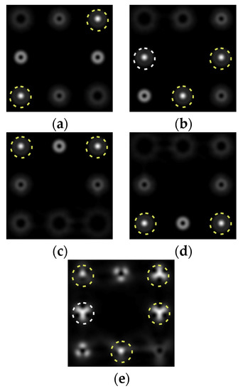 Action of an eight-channel DOE, matched with optical vortices in the analysis of vortex fields with cylindrical polarization of the second order (p = 2): (a) m = 0, (b) m = 1, (c) m = −1, (d) m = 0, 1, and (e) m = −1, 1.