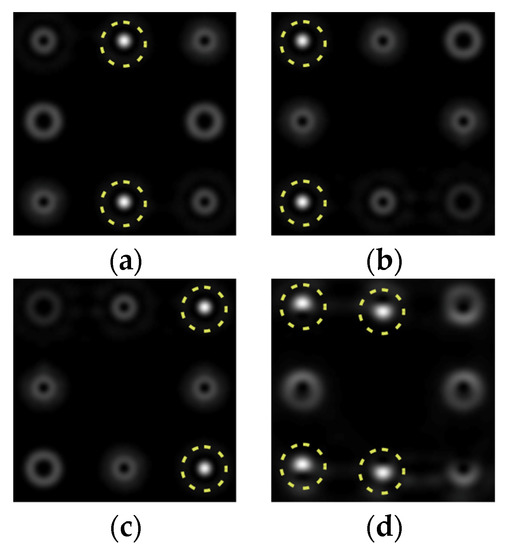 The vortex field (1) has many orthogonal states in accordance with the order of the vortex phase singularity m, which can be unambiguously detected using multi-order DOEs [17,18,19,20,21,22,23,31,32,33]; although, the polarization state is not recognized.
