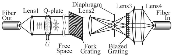 All of the above methods use the intensity distribution in diffraction orders as an indicator of the presence of certain beams, and in the case of identifying the polarization state of the beam, a simultaneous analysis of several diffraction orders is required. On the other hand, to transmit signals in the atmosphere, it is convenient to use existing commercial fiber-optic communication systems with replacement of fiber sections with free space and modification of a number of system elements [28,29].
