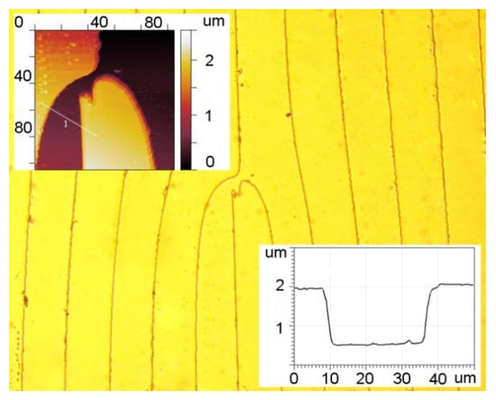 The blazed grating was made by direct laser writing using a circular laser writing station CLWS-2014. The lithography process was carried out in a 6 μm thick FP-3535 positive photoresist layer, which was previously deposited on a quartz substrate by centrifugation. To obtain an exact correspondence of the height and slope of the blazed grating profile, additional studies were performed to select the lithography regime. At the final writing cycle, the deviation of the microrelief height did not exceed 100 nm. A 3D image of the obtained relief and grating profile with a height of 1.75 μm and a period of 120 μm, measured with a Zygo NewView 5000 optical interferometer, is shown in Figure 9.
