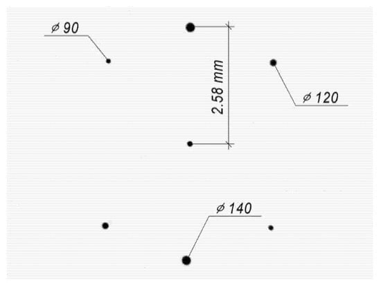 Point diaphragms were made by thermochemical oxidation of thin chromium films on a CLWS-200 setup. Holes of different diameters are used to match the sizes of diffraction orders for different sizes of the input beam. The center hole is used for accurate alignment with the zero-order diffraction in the system. Further alignment of +1 and −1 orders is carried out by simple rotation of the substrate with the diaphragms. Then, the central hole is closed. The view of the diaphragm is shown in Figure 8.