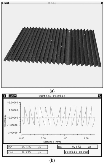 Image of the manufactured blazed grating: (a) 3D image of the relief, and (b) cross-section of the relief profile.