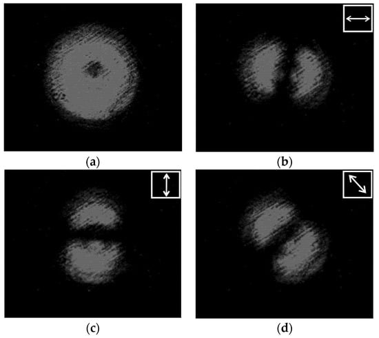 First, we tested and adjusted the Q-plate. Figure 10 shows the intensity distributions in the beams passed through the Q-plate at different positions of the polarizer axis.