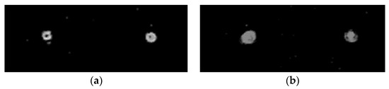 The method for recognizing the polarization state of a beam is based on the use of a phase element in the form of a fork-shaped grating, which is matched with vortices of the order of m = ± 1. The performed simulation (see Figure 3a) showed that when a multi-order DOE is illuminated by a beam with a first-order cylindrical polarization state, two diffraction maxima are formed corresponding to vortices of the order of m = ± 1. For beams with homogeneous polarization that do not contain vortices, circular intensity distributions are observed in diffraction orders.