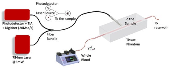 Experimental Setup. The laser light illuminates the tissue phantom surface at a 45-degree angle and the scattered diffused light is collected through the reflection probe fiber bundle which is coupled to a photoreceiver. The glass tube that emulates a blood vessel is embedded in the tissue phantom 5 mm below the surface.