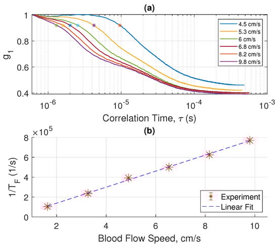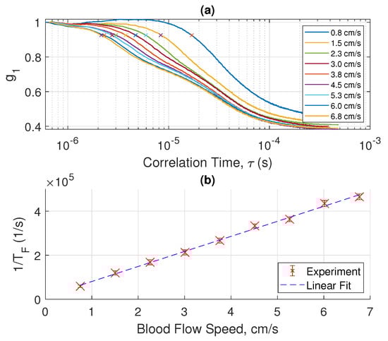 (a) Measured E-field correlation function () versus flow speed of whole blood for a tube diameter of 1.68 mm. (b) By taking the inverse of the correlation time at the first inflection point in (a), marked using ‘X’, the decorrelation rate () is plotted versus the flow speed. The scattered data set with error bars represents the 95% confidence interval over 25 measurements, each for a duration of 1 s. The dashed line is a linear fit of the measured data.