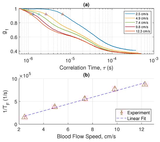 (a) Measured E-field correlation function () versus flow speed of whole blood for a tube diameter of 0.93 mm. (b) By taking the inverse of the correlation time at the first inflection point in (a), marked using ‘△’, the decorrelation rate () is plotted versus the flow speed. The scattered data set with error bars represents the 95% confidence interval over 25 measurements, each for a duration of 1 s. The dashed line is a linear fit of the measured data.