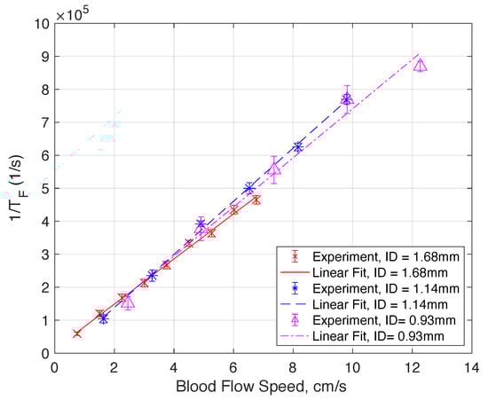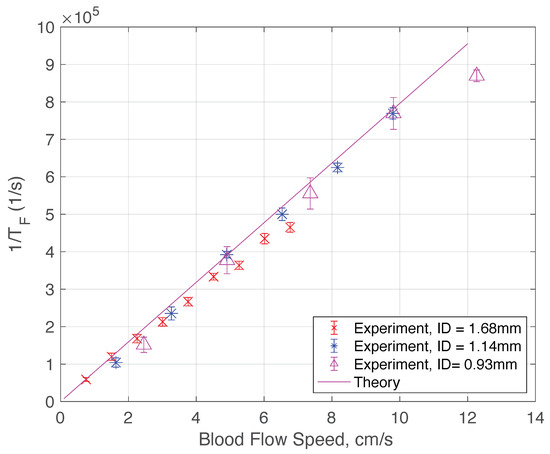 Comparison between theoretical calculations (from Equation (17) and experimentally measured decorrelation rates under different blood flow speeds and tube diameters. The scattered data set with the error bar represents the 95% confidence interval over 25 measurements. Each measurement took 1 s. The following parameters are used in the calculations: , and for deoxygenated blood [41,42,43,44].