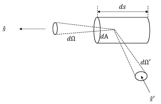 in which I is the light specific intensity with a unit Wmsr, is the particle concentration, is the scattering cross section, is the total scattering cross section which is the summation of scattering cross section and absorption cross section. is the normalized differential scattering cross section which is sometimes called the phase function and it is unitless, and is the source intensity which has a unit of Wmsr. Figure 6 illustrates the orientations and coordinates for an infinitesimal scattering volume. Equation (3) contains 5 coordinates: where define the position vector of the light intensity, and represent the beam’s propagation direction. The unit vectors and represent the direction of the incident light and the propagation direction after scattering.