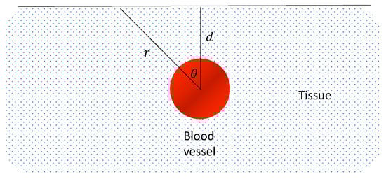 We assume a plane wave illumination at the surface. Despite the simplification, the approximation can yield a satisfactory result in good agreement with the experiment. To simplify the practical application, we adopted an experimental design where a single detector covers an area defined by the numerical aperture of 6 hexagonally arranged multimode fiber surrounding the light source (see Figure 1). Assuming the blood vessel is cylindrically symmetric, we used a 2D model, as shown in Figure 7.