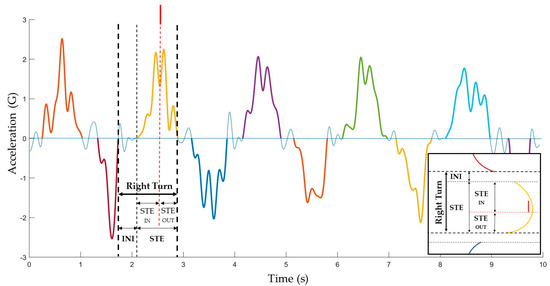 By fusing the accelerometer information with an M-BTS that provides the position of the gate on the magnetometer signal [39], it was possible to divide the STE phase by the turn’s gate position [11] leading to the steering phases into the turn (STEIN) and out of the turn (STEOUT), where the acceleration on the Y-axis was moving away from zero or approaching zero, respectively (Figure 3).