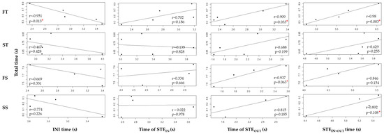 By comparing INI time with total time, it was observed that as INI time increased, the total time decreased in all courses. The FT course had the highest and most significant correlation (r = −0.951, p-value = 0.013). In the FS and SS courses, the correlations between INI time and total time were high but not statistically significant (r = −0.669, p-value = 0.331 and r = −0.774, p-value = 0.226, respectively). Regarding the ST course, the correlation was weak and not significant (r = −0.467, p-value = 0.428).