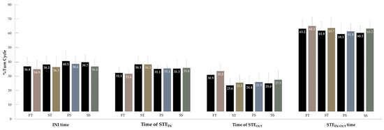 Finally, for each run, the times corresponding to the same phase were added together, so the total time was decomposed into three partial times: INI time, time of STEIN and time of STEOUT. The two steering times were added together to obtain STE time, hereinafter referred to as STEIN+OUT time. For each run, each of these partial times was expressed as a percentage of the total time.