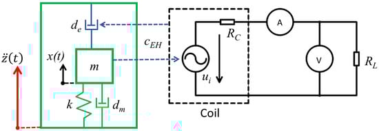 The kinetic electromagnetic energy harvesting system could be described by a multidomain model in the form of coupled mechanical and electrical systems, as depicted in Figure 2. The mechanical resonator is excited by ambient mechanical shocks z to the oscillating sleeper and this results in the relative movement x. The relative movement x of the mass m in the magnetic circuit consisting of the frame and a fixed coil is inversely proportional to the mechanical damping dm. Due to Faraday’s law, the relative movement of the magnetic circuit results in a change in the magnetic field of the coil, inducing an electromotive voltage ui. A model of an electromagnetic coupling coefficient was used for the description of the interaction between both the mechanical and electrical domains. The induced voltage depends on the design of the electromagnetic transducer (the electromagnetic coupling coefficient cEH) and its relative velocity. When a resistive electrical load RL is connected to a coil, then a current flows through the coil and electrical power is extracted from the system. The electrical power extracted from this system provides electromechanical feedback in a form of an electrical damping, which is depicted as a damper de. This electrical damping feedback is proportional to the electromagnetic coupling coefficient cEH. A derived mathematical model with one degree of freedom was used for predicting the harvested power in a resonance operation.