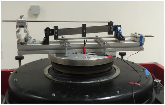 The designed parameters of the model are used to predict the output voltage and power in a resonance operation. The presented electro-mechanical equations in combination with the model of peak voltage and peak power described in Section 3.1 were used for output calculations for a variable resistive load. The experiment was conducted on a laboratory shaker, an RMS SW8142–SWH600APP, connected to its auxiliary measurement instruments and depicted in Figure 6. The harvested voltage was measured on an oscilloscope, a Rigol MSO 5204. Both the model and experiment were excited in a resonance frequency with an acceleration amplitude of 1 ms−2.