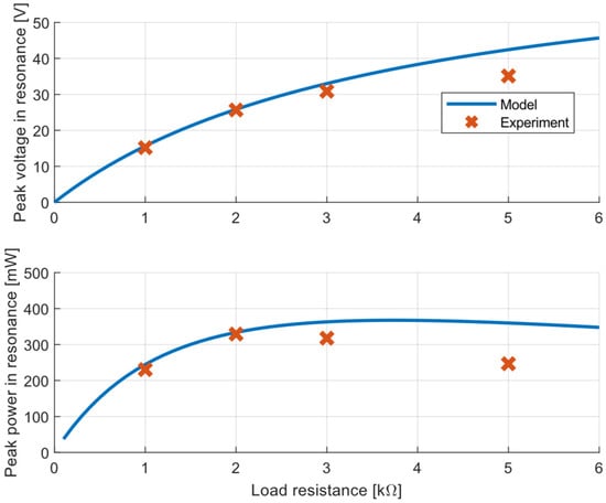 Voltage and power responses in resonance operation vs. load resistance—simulation results and measurements with excitation acceleration amplitude of 1 ms−2.