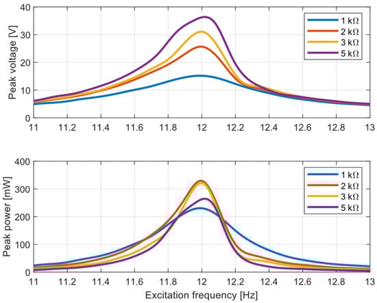 The measured peak voltage and peak power are depicted in Figure 8. The lab experiment was made with four different load resistances: 1, 2, 3 and 5 kΩ. The voltage response was proportional to the load resistance. It was caused by an increase in the velocity due to decreasing electrical damping. However, the output power peaks at around 2 kΩ, and below and above that value the power amplitudes decreased. This power maximum was observed in a resonance operation, but outside of the resonance operation the device harvested higher power with the lowest load resistance of 1 kΩ. The kinetic energy harvester with a lower resistance provided higher power outside of a resonance operation. Based on this fact, it is suitable to use a resistive load of 2 kΩ in a resonance operation but use a lower value of 1 kΩ for a non-resonance operation. This fact is discussed further in the next section.
