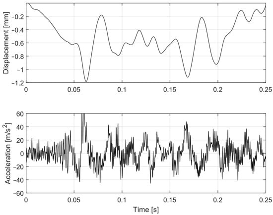 The typical transient dynamic response of a kinetic energy harvester was provided with real train-induced vibrations as inputs. Real vibrations in the trackside sleeper, where the vibrations were not pure sinusoidal, but rather had the characteristic of a series of mechanical pulses, are shown in Figure 9. The acceleration and displacement of the sleeper was measured on a trackside in the Czech Republic using an inertial accelerometer on the sleeper and a capacitive displacement sensor mounted between the sleeper and a fixed point. This detail is for a single bogie consisting of two train wheels. The movement of the sleeper had general characteristics based on many parameters of the track subgrade. For this particular sleeper movement, the shown input vibrations for whole trains are used for the kinetic energy harvester test. Experiments with different electric loads were made with the aim of finding an optimal resistive load for a maximal energy harvesting potential.