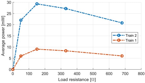 As Figure 10 shows, the maximal average power was measured with a resistive load of 150 Ω, which was the same as the coil resistance. The output power was lower at higher resistive loads due to lower damping and lower energy harvesting from trackside vibrations. The power was lower at lower resistive loads due to higher energy dissipation on the coil resistance rather than the load resistance.
