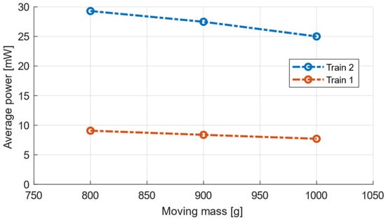 Different weights of the seismic mass of this device were tested in order to achieve the optimal design of this energy harvesting device. The default weight of the moving mass, 800 g, was increased using an additional external weight. Unfortunately, decreasing the weight below the default value without significant structural modifications was not possible. A relation of this mass value to the generated power was experimentally verified, and the results of his test are shown in Figure 11. It was possible to add an extra mass to the initially calculated seismic mass of 800 g; however, it is evident that the output power would decrease with higher values of the seismic mass, and it was verified that the modelled mass of 800 g provided the most effective energy harvesting operation with the given train vibration data. On the other hand, it was not possible to decrease the mass in the current design due to the nature of the magnetic circuit, which needs a minimal cross-section area of the core to function properly.