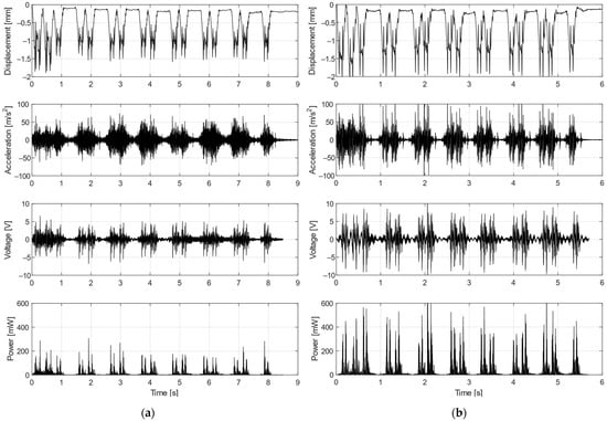 Time-domain measurements of the voltage and power with the excitation acceleration and displacement for both testing trains are shown in Figure 12. These measurements were done with the optimal resistive load of 150 Ω. The average harvested power and total harvested energy for a passing train are presented in Table 2.