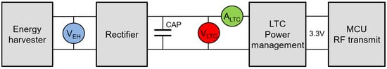 The electric diagram of an energy harvesting system with a sensor node and communication module is shown in Figure 13. The developed kinetic energy harvester is connected to previously published electronic systems. It consists of a rectifier, a storage capacitor with a capacity of 493 μF, an LTC 3588 power management circuit, an analogue front end for the sensing signal, and a communication module based on the NRF24L01 chip from Nordic Semiconductor.