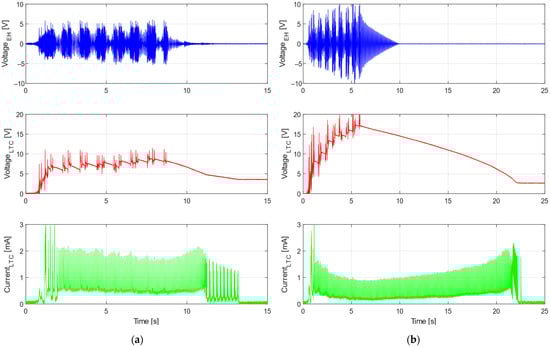 Measured vibration signals for both types of passing trains (the same as those in the previous section) were used for the test of this autonomous source of energy for the sensing node and communication module. Measurements of electrical signals highlighted in Figure 13 (the voltage induced by the energy harvester, the input voltage and the current into the LTC power management circuit of the wireless sensor node) were used for the harvester performance assessment.