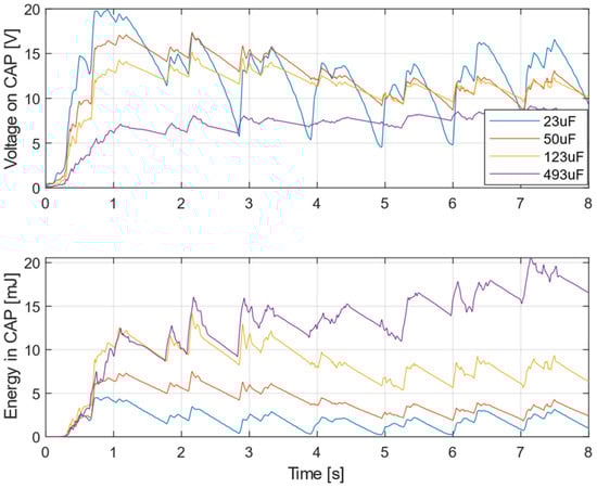 Measurement with different capacitor values are depicted in Figure 15. The excitation acceleration data were acquired from Train 1, similarly to Figure 14a. For a better understanding of the energy storage capabilities, the graph of the voltage is accompanied by a graph depicting the calculated energy stored in the capacitor. Initially, the lower capacity caused the voltage to increase rapidly; however, after a few seconds of operation the stored energy was lower compared to the case with higher capacity. Furthermore, with lower capacity values the voltage tended to fluctuate significantly.