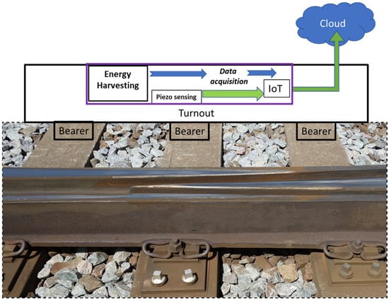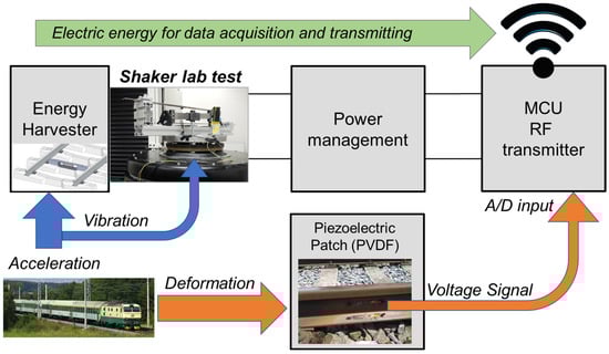 A new generation of smart sleepers could detect overloaded trains, trains with abnormal wheel wear or problems with suspension systems, all of which contribute to a significantly higher load on the track and a rapidly increasing wear of railways. The railway wear or significant changes in subgrade and ballast properties—mainly the gap under a sleeper—could also be detected by smart monitoring systems embedded in sleepers. The proposed concept of autonomous application is shown in Figure 16. The kinetic energy harvester could be integrated or embedded inside innovative sleepers and provide electricity for autonomous monitoring. The sensing node could be integrated into rails in the form of a piezoelectric layer that generates an active voltage signal and does not consume power. This system could be even more affordable if PVDF piezopolymers for structural monitoring were used.