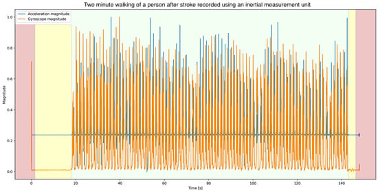 Visualisation of the data-processing steps prior to calculating the gait features. In the figure, the acceleration magnitude (blue) and gyroscope magnitude (orange) of a two-minute walking assessment is depicted. Firstly, the first and last two seconds (red planes) were excluded from analysis. The remaining signal was then used to calculate the threshold to determine the prior- and post-walking stationary periods (yellow planes). The residual signal was included in further analysis. For demonstrative purposes, the magnitude of acceleration and gyroscope were normalised using a min–max normalisation.