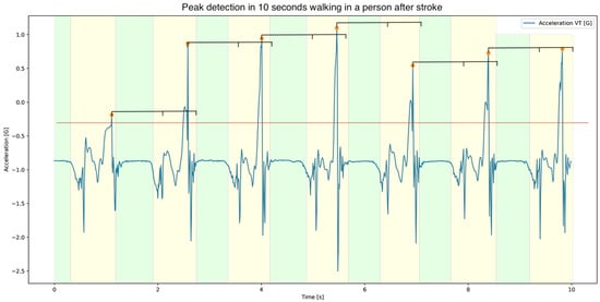 Visualisation of the custom-made stride-detection algorithm during 10 s of walking by a person after stroke. The vertical acceleration is depicted as a blue line. First, the strides were detected using a peak-detection algorithm; the threshold is depicted as the orange line and the search window is depicted as the black line above the peaks. The found peaks are marked with an orange circle. Then, a false-negative peak detection was applied, and the stance phases were identified as the stationary periods between peaks (green planes). Lastly, a false-positive peak detection was applied in case no stationary period between peaks could be identified. The signal that was not marked as part of the stance phase was considered to be the swing phase (yellow planes).