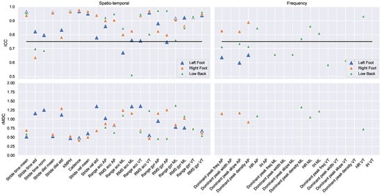 The ICC values (top panels) and rMDC values (bottom panels) of the spatio-temporal and frequency features for the left foot (blue triangle), the right foot (orange triangle), and the low back (green triangle). All outcomes above the horizontal black line were measured with good–excellent reliability. The exact outcomes of all gait features are provided in Table A1 in the Appendix A.
