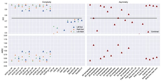 The ICC values (top panels) and rMDC values (bottom panels) of the complexity and asymmetry features for the left foot (blue triangle), the right foot (orange triangle), the low back (green triangle), and combined (red triangle). All outcomes above the horizontal black line were measured with good–excellent reliability. The exact outcomes of all gait features are provided in Table A1 in the Appendix A.