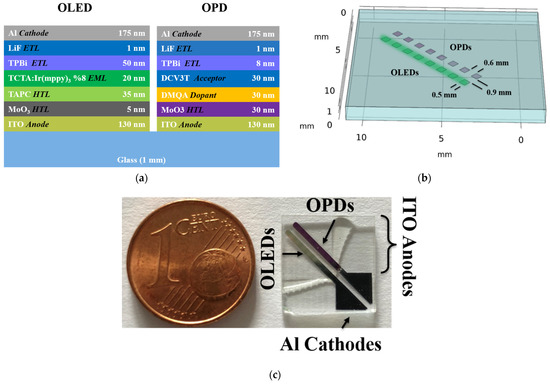 (a) Schematic diagram of the OLED and OPD stacks on a single glass substrate; (b) geometrical model of the OLED–OPD unit layout with 8 units on one test chip; (c) photograph of a fabricated test chip.