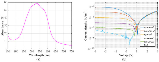 Optical and electrical characterization of the DMQA.DCV3T OPD. (a) UV-Vis measurement of 60 nm DMQA:DCV3T absorptive bilayer; (b) current density–voltage characteristics in the dark and under illumination with a subsequently filtered 520 nm laser.