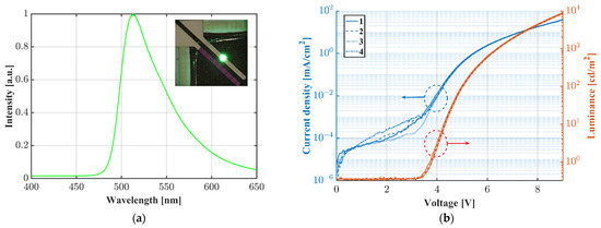 (a) Normalized spectrum of the green emitting (peaking at ~512 nm) Ir(mppy)3 OLED as an example; (b) current density and luminance vs. voltage characteristics of the fabricated bottom-emitting OLED.