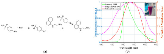 (a) Schematic of the Griess reaction for spectrophotometric quantification of the nitrite concentration; (b) overview of the OLED emission spectrum as well as the absorption spectra of the OPD and the Griess-reaction-based azo dye. The chosen organic composition of the OLED–OPD system has overlapping emission and absorbance spectra for the highest nitrite sensitivity. The inset shows, as an example, strong absorbance at around 540 nm for a nitrite standard sample of 30 mg/L.