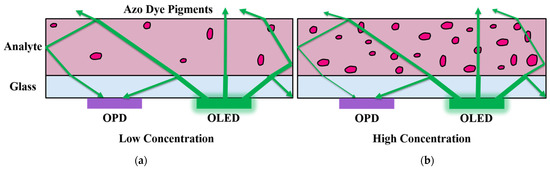 As depicted in Figure 5b, we chose the organic composition of the OLED–OPD matrix for the highest absorbance of the green OLED light on the OPD. Due to total internal reflection (TIR) the light propagated partly inside the glass substrate and induced photocurrent in the OPD, since the OLED is an extended device with isotropic emission. The following Figure 6 shows a schematic of the expected azo dye concentration dependent signal change of the OLED–OPD matrix unit. In Figure 6a the light propagated partly inside the glass substrate and was partly reflected back onto the OPD after traveling inside the analyte. For lower sample concentration the partly absorbed light was reflected multiple times at the surfaces inside the liquid chamber and was partly reflected back onto the OPD. For higher concentration (Figure 6b) of nitrite standard sample and, consequently, higher concentration of the azo dye, the absorbance of the light inside the chamber increased. Thus, only a fraction of initial emitted amount of light was reflected back onto the OPD and the photocurrent consequently decreased.