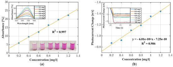 Figure 7a,b shows the measurement of the premixed Griess reagent and nitrite standard solutions. Prior to the measurements with the OLED–OPD unit we tested the nitrite samples with a UV-Vis spectrometer (Lambda 800, PerkinElmer, Waltham, MA, USA). Figure 7a shows a calibration plot with a linearity of 99% as a reference. Figure 7b shows the measurement with the investigated OLED–OPD sensing unit. We started each measurement with an empty fluid chamber and subsequently added samples of 200 µL ranging from 0.2 to 1.2 mg/L nitrite with a pipette. The Griess complex recorded the signal response in real time. The signal was a superposition of waveguided light, stray light and light passing through the liquid chamber. The detected intensity depended on the absorbance of light by the azo dye. The observed decrease in the photocurrent upon addition of the nitrite solution is shown in the inset of Figure 7b. For example, the photocurrent for the empty chamber was 2.46 nA and after addition of a 1.0 mg/L nitrite solution the photo current changed to 1.10 nA. Thus, the absolute value of the current was reduced by 1.36 nA. The calibration function obtained from these measurements was found to be linear up to 1.2 mg/L, offering linearity of approximately 99%. The sensitivity was calculated as S = 0.6 nA/(mg/L). The standard deviation current noise level was determined as σ = 9.23 pA. This yielded a limit of detection (LOD) of LOD = 3 × σ/S = 46 µg/L (1.0 µM).