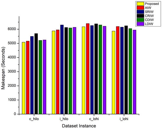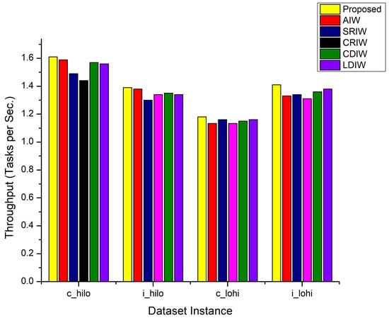 Experimental results show that AIW has acquired minimum overall execution time (makespan) and higher throughput as compared to SRIW, CRIW, CDIW, and LDIW for the execution of i_hilo and c_hilo instances of the HCSP dataset. This reveals that the performance of AIW is better in terms of makespan and throughput for comparatively smaller datasets than the larger one. This is because the size of i_hilo and c_hilo instances based workload are smaller in terms of total MI as compared to workload of i_lohi and c_lohi instances of HCSP dataset.