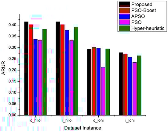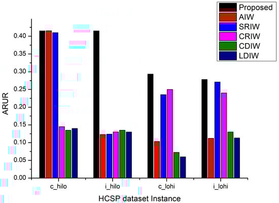 To perform evaluation of AdPSO, the ARUR results are obtained and compared against the AIW, SRIW, CRIW, CDIW, and LDIW approaches as shown in Figure 3. For the c_hilo instance, the AIW, SRIW and proposed approach have shown almost similar ARUR performance. The rest of the three approaches resulted in 60% less ARUR as compared to the AIW, SRIW, and proposed approaches. For the c_lohi and i_lohi datasets, the proposed approach dominated the rest of the contemporary approaches followed by SRIW and CRIW approaches. The AIW approach has shown poor ARUR performance for the i_lohi dataset instance whereas the LDIW approach has shown the lowest ARUR performance for the c_lohi dataset. However, for the i_hilo dataset, the proposed approach dominated all the approaches by almost 2 times against the other approaches.