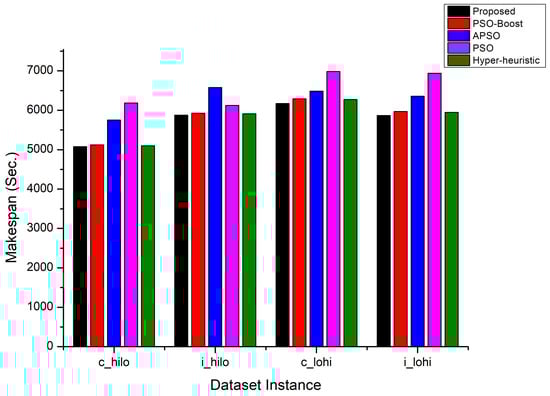 The evaluation is then extended and proposed PSO approach is compared against PSO-Boost, APSO, PSO, and Hyper-heuristic approaches using same HCSP benchmark datasets. The best and worst case results concerning the makespan for the compared approaches are shown in Figure 4. For the c_hilo dataset, the AdPSO has better performed the other three approaches by an improvement of 14–27%. The PSO-BOOST and Hyper-heuristic approaches have shown similar behavior for the i_hilo dataset instance while negligible degradation is observed for the c_lohi and i_lohi instances. The PSO approach has shown poor makespan performance whereas the APSO approach shown steady behavior. All these results advocates the effectiveness of the proposed approach.